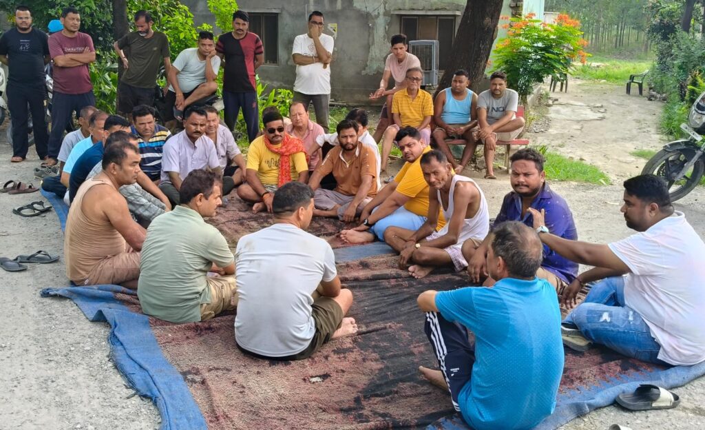फोटो। शांतिपुरी न०४ में सड़क किनारे चौरीकरण को लेकर बैठक करते हुये ग्रामीण