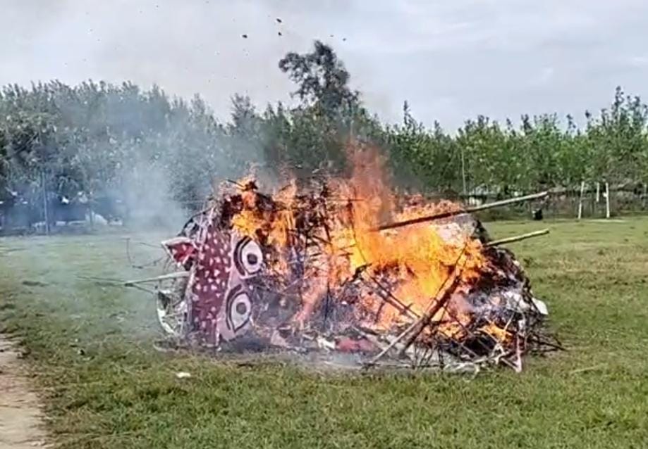 वही रावण, मेघनाथ व कुम्भकरण का पुतला बारिश मे भीगने के बाद गिरने के बावजूद जनता ने अहंकारी रूपी रावण के पुतले को जलाकर सत्य की असत्य पर जीत दर्शायी गई।
